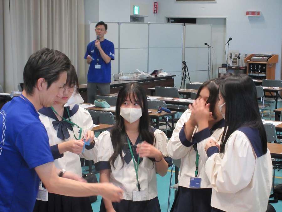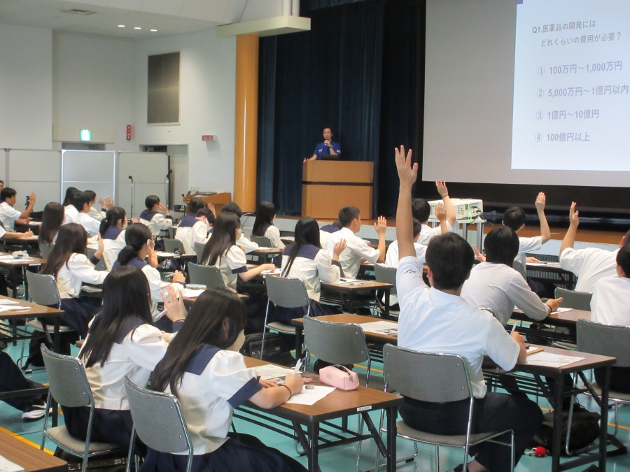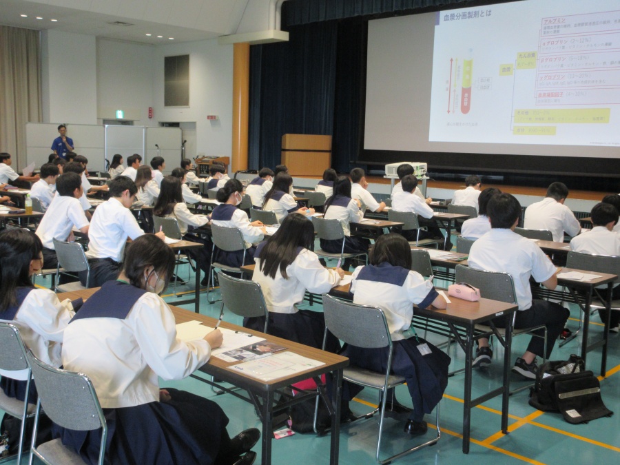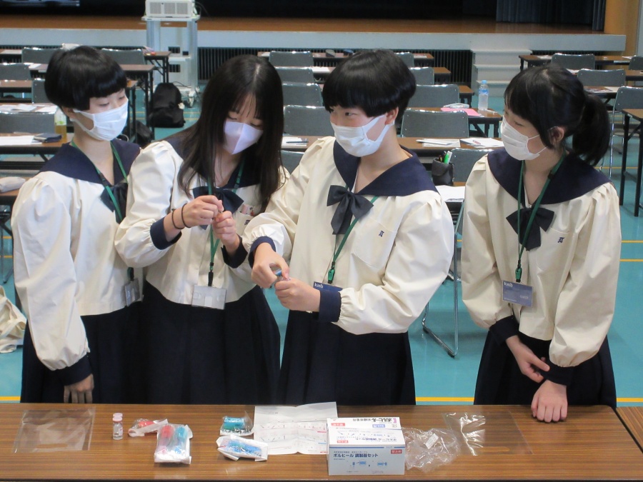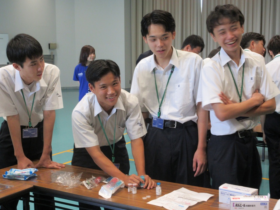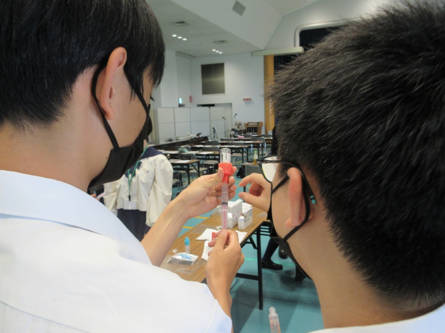 ・ワクチンが世の中に出回る前に、こんなにも多大な時間と労力がかかっているのだということだ。基礎研究、動物実験、臨床実験を9~16年かけて行い、費用は数百億~数千億円、さらに成功確率は3万分の1ということを知り、非常に根気のいる開発なのだと感じた。また、演習は実際に医療の現場で使用されている血液の凝固反応を利用した組織接着剤ボルヒールを使うことができ、とても医療、医療の研究への興味が高まった。外科や救急医療の現場でも応用されていて、脳や肺など部位によって使用するタイプ(重層、混合、スプレー)が分かれており、当たり前かもしれないが本当に研究しつくされているのだと改めて感じた。自分たちがしている課題研究も一生懸命にしなければ結果はでないなと改めて実感しました。このような機会があったことにとても感謝しています。これからも感謝を忘れずに努力し続けたいなと思います。