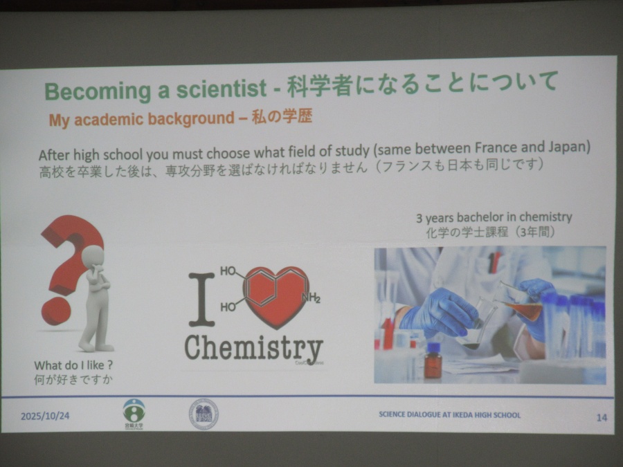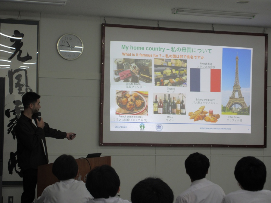 令和7年10月24日(金)に第2回IMSが実施されました。IMSは日本学術振興会(JSPS)による、国内大学大学院・研究機関在籍の外国人科学研究者による英語での講義・実験を実施し、国際性のある科学・技術への興味関心を育む本校独自の講座です。