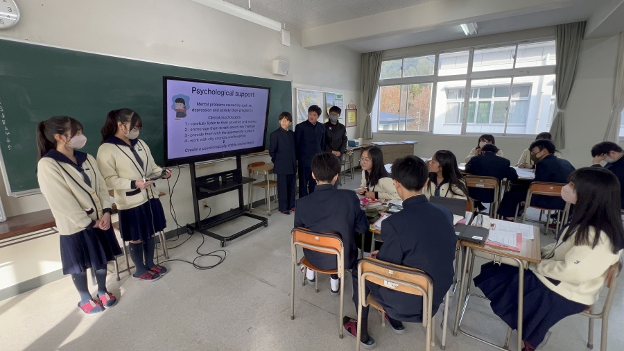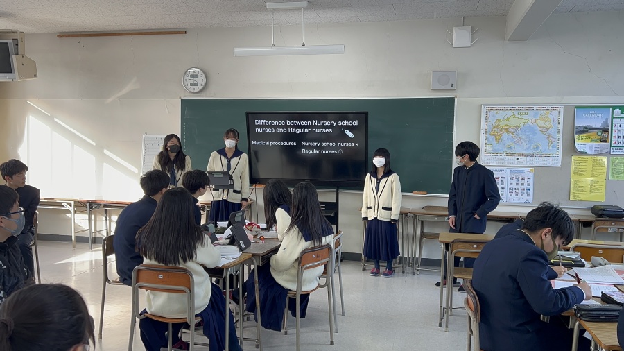 各学年でこれまで取り組んできたSCPの探究学習を、英語でプレゼンテーションする取り組みで、生徒たちも慣れない英語プレゼンに懸命に挑戦していました。