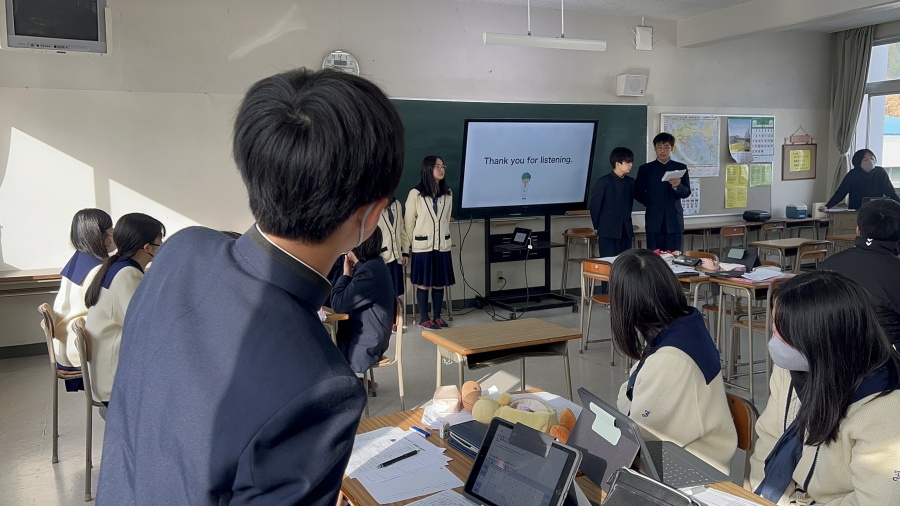 先日のSCP発表会の内容を英語でプレゼンテーションを行うSCP英語発表会が行われました(写真は中2)。