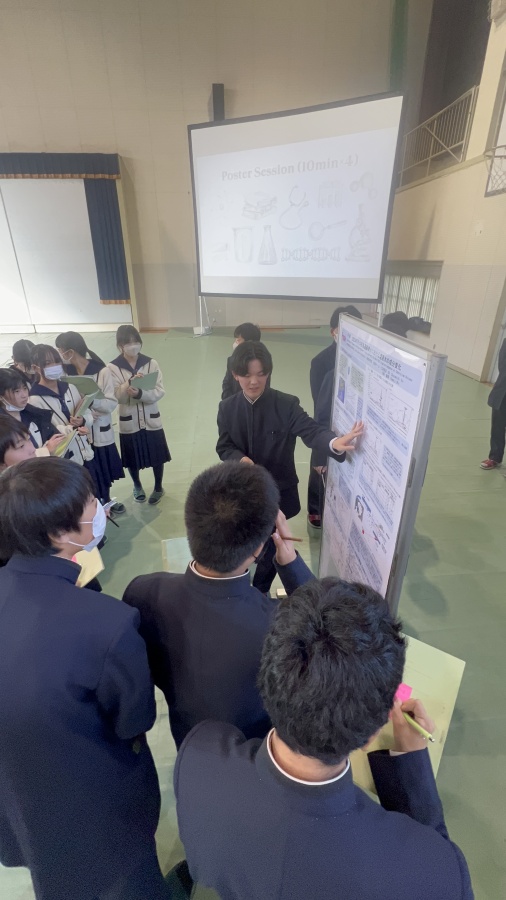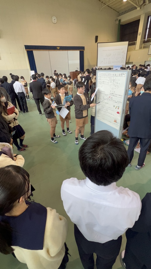 今年のIKEDA Science Dayは小中高それぞれの代表がポスター発表を行い、他の生徒はそれらの発表を交代で聞き、質疑応答を行いました。